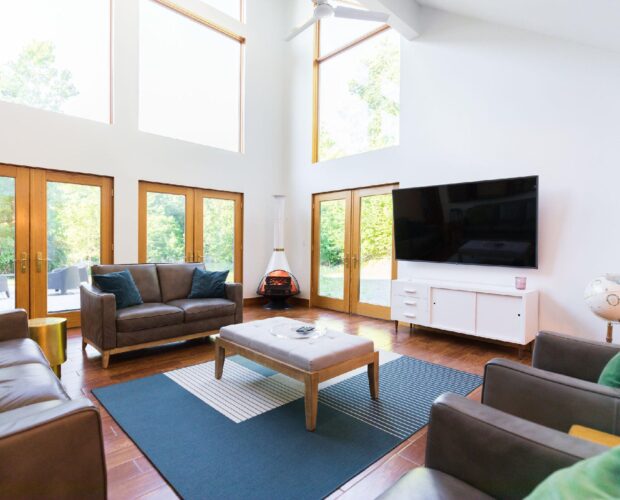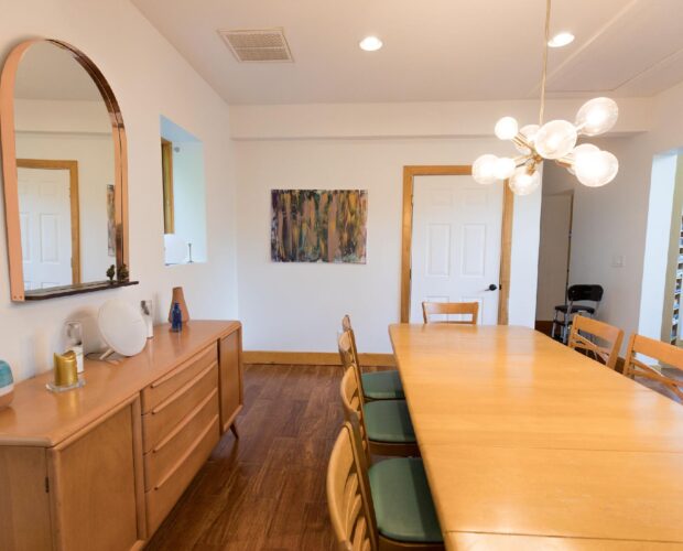 LIVING SPACE: The living room features mid-century modern décor with a vaulted ceiling, seating for family and friends, dining room with seating for 10, large 75 inch TV and Malm electric fireplace for ambience. A separate family room on the opposite side of the house offers more space to watch TV (medium sized TV with streaming options) or unwind as well as a separate area for WFH.