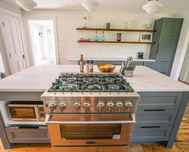 The chef’s kitchen features an open design, including a breakfast nook surrounded by windows infusing views of nature, a large island with seating for four and a full dining area with seating for six.