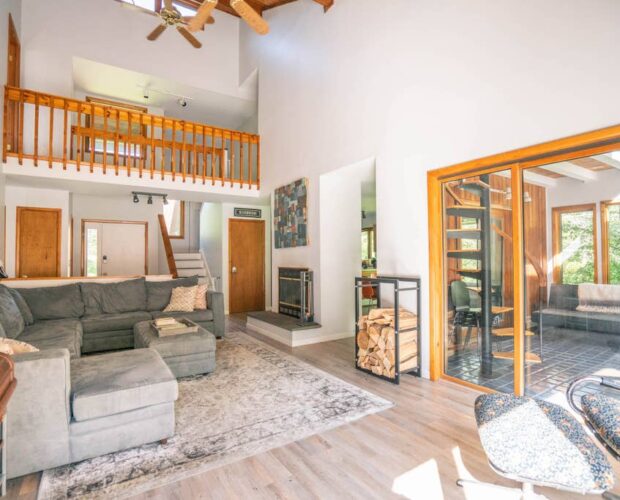 LIVING SPACE: The living room features double height ceilings and a wood burning fireplace as well as a sectional couch for cozying up with a good book or glass of wine. There is a Smart TV as well for movie nights and lazy afternoons.